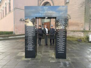 Erste Station war das Kraushaar-Denkmal „Wider das Vergessen“ in St. Wendel. Dort kamen Herr Hartmann und der Landesverband mit Jana Bakal von der Jüdischen Kultusgemeinde Trier ins Gespräch. Anschließend folgte der Besuch des 2024 eingeweihten Mahnmals für Sinti und Roma im Echelmeyerpark in Saarbrücken.